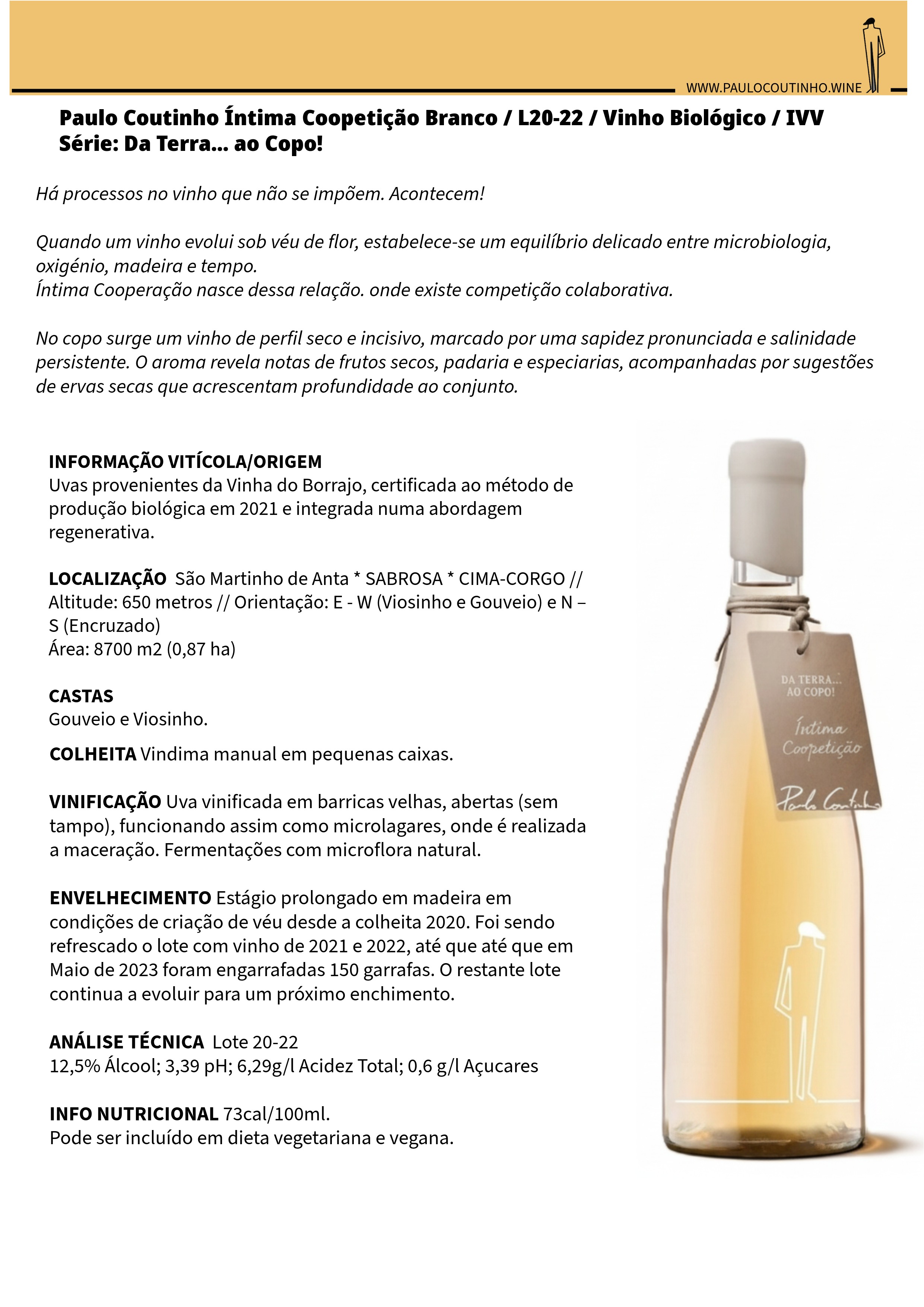 No copo revela um perfil seco e incisivo, com sapidez marcada e salinidade persistente. O aroma apresenta notas de frutos secos, padaria, especiarias e ervas secas, refletindo a complexidade do seu percurso.